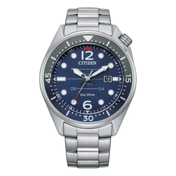 Citizen Eco-Drive Watch – “Of” Collection “Seaplane” Line – with blue dial and two-tone blue and gray aluminum bezel. Men’s watch with eco-drive time and date movement with 43mm steel bracelet and case with crown positioned at 2 o’clock. Free and immediate Shipping, 24h delivery and Secure Payments even in installments with Klarna, Soisy or Scalapay.